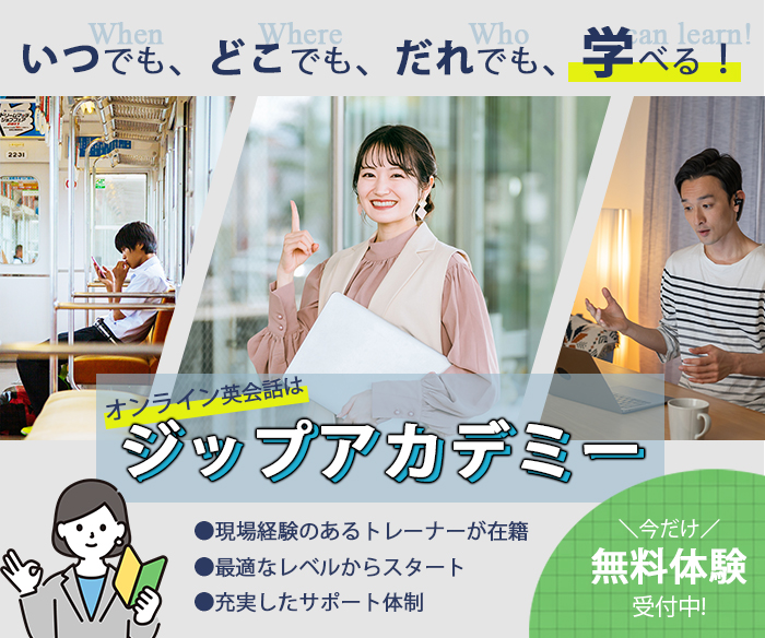 - 「ジップ」は迅速に行動する、元気よくやる等の意味合いがあり、初心者の方でも始めやすいというイメージを持っていただくためにつけました。英会話のハードルをとにかく低く見せるため、誰もが学んだことのある英単語を使った「いつでも・どこでも・誰でも・学べる」というキャッチフレーズを記載しました。また、画像は帰りの電車や夜の自由な時間で「いつでもどこでも」、3名の世代をバラバラにすることで「誰でも」を強調しました。色は学問や知識、安心感の色である青をメインで使用し、無料体験の枠や強調する部分には初心者マークと同じ緑と黄色を使用しました。