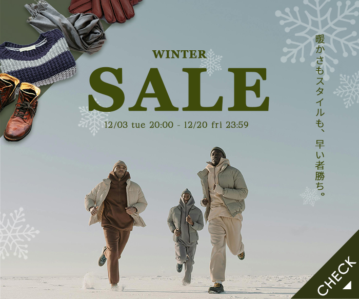 - 「今からでもまだ間に合う冬物アイテム」をテーマに、大人の男性が冬のセールへ駆け込むイメージでデザインしました。 セール広告は大きな文字や派手な配色のものが多いですが、ファッションサイトのブランドイメージを損なわないよう、落ち着いた色味とシンプルなあしらいでまとめています。 どのようなアイテムがセール対象になるのかを左上部に配置し、右下部には「CHECK」のあしらいを入れることで視線誘導を意識しました。全体はプレゼントの包装をイメージしたデザインに仕上げています。 ビジュアルには、冬の服に身を包んだ男性たちが走っている写真を使用し、セールならではの高揚感や競争心を表現しました。「暖かさ」と「お得さ」をセールで先に手に入れよう、というメッセージを込めています。