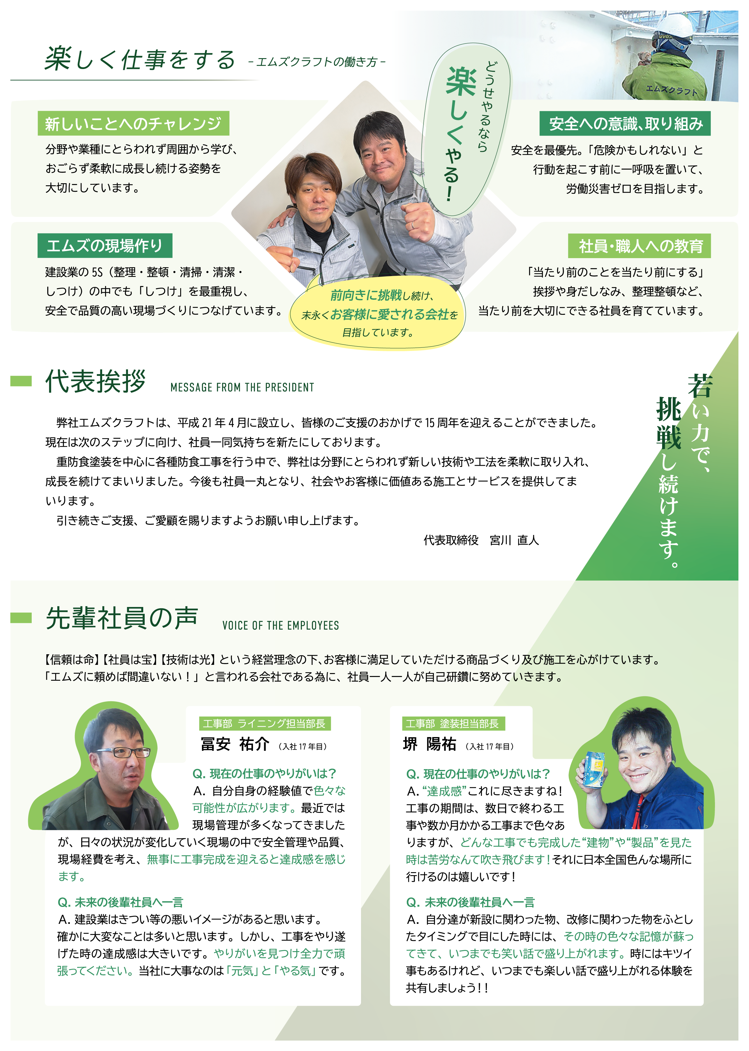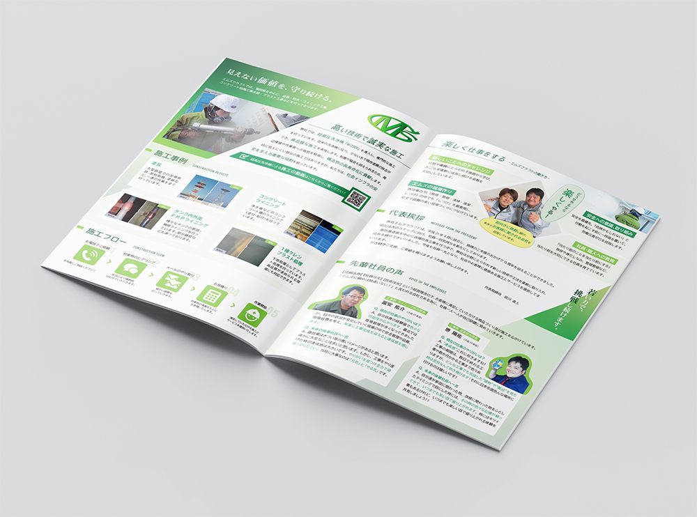 右ページでは、「楽しく仕事をする」という同社の姿勢を軸に、安全対策や教育体制にも力を入れている点が伝わるよう構成しました。