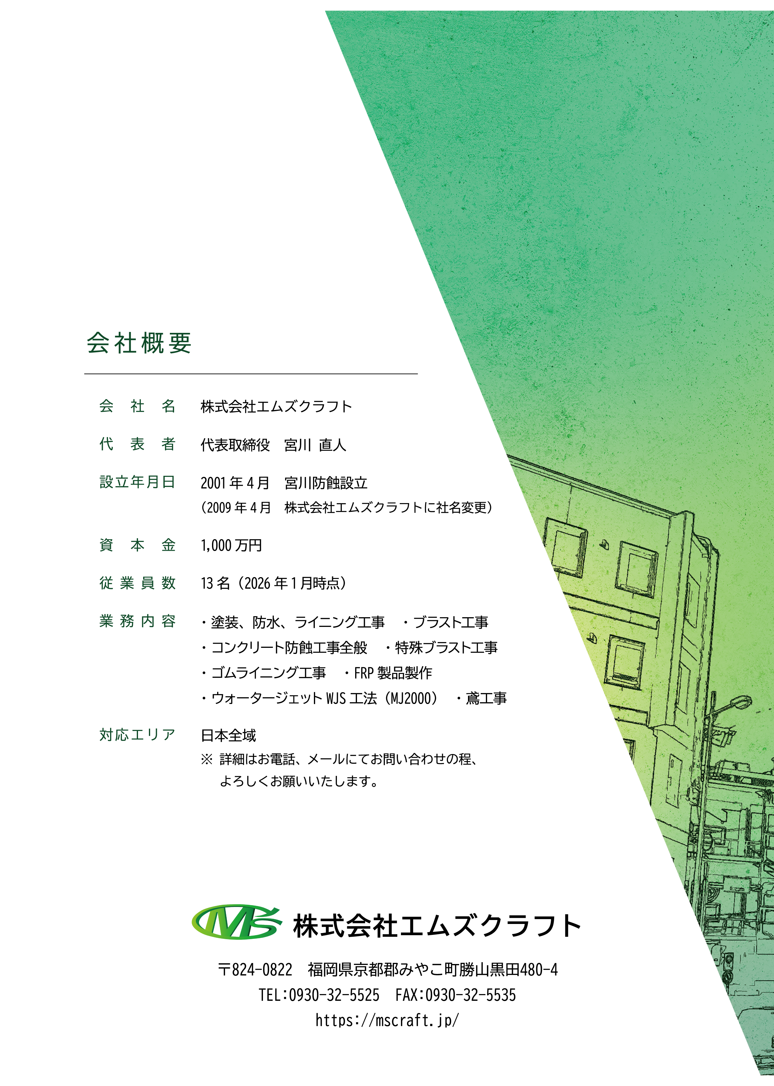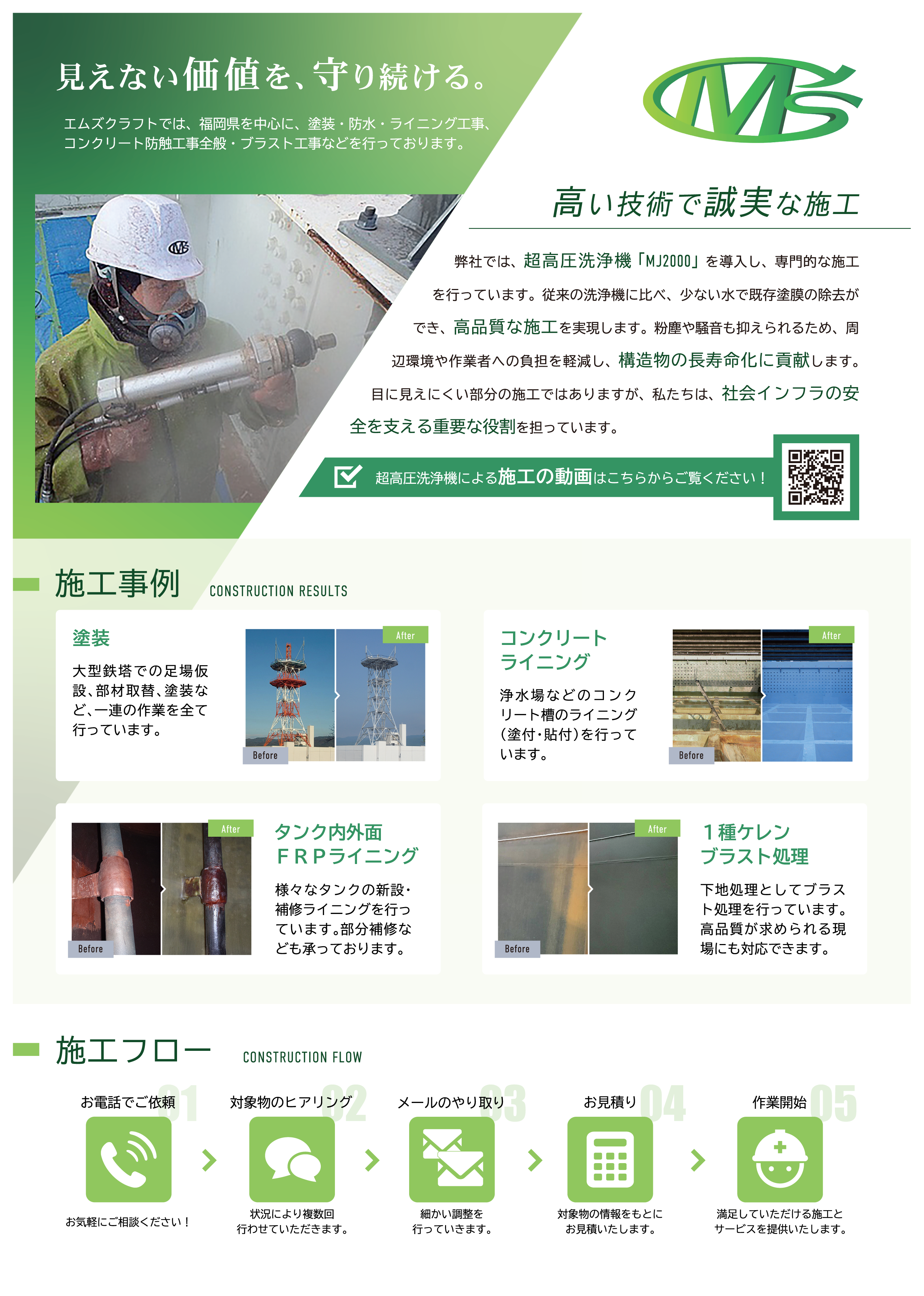 エムズクラフト様の主力事業である塗装・ライニングは、日常生活の中で施工の様子やBefore/Afterを目にする機会が少ない分、社会を支える重要な役割が伝わりにくい分野でもあります。